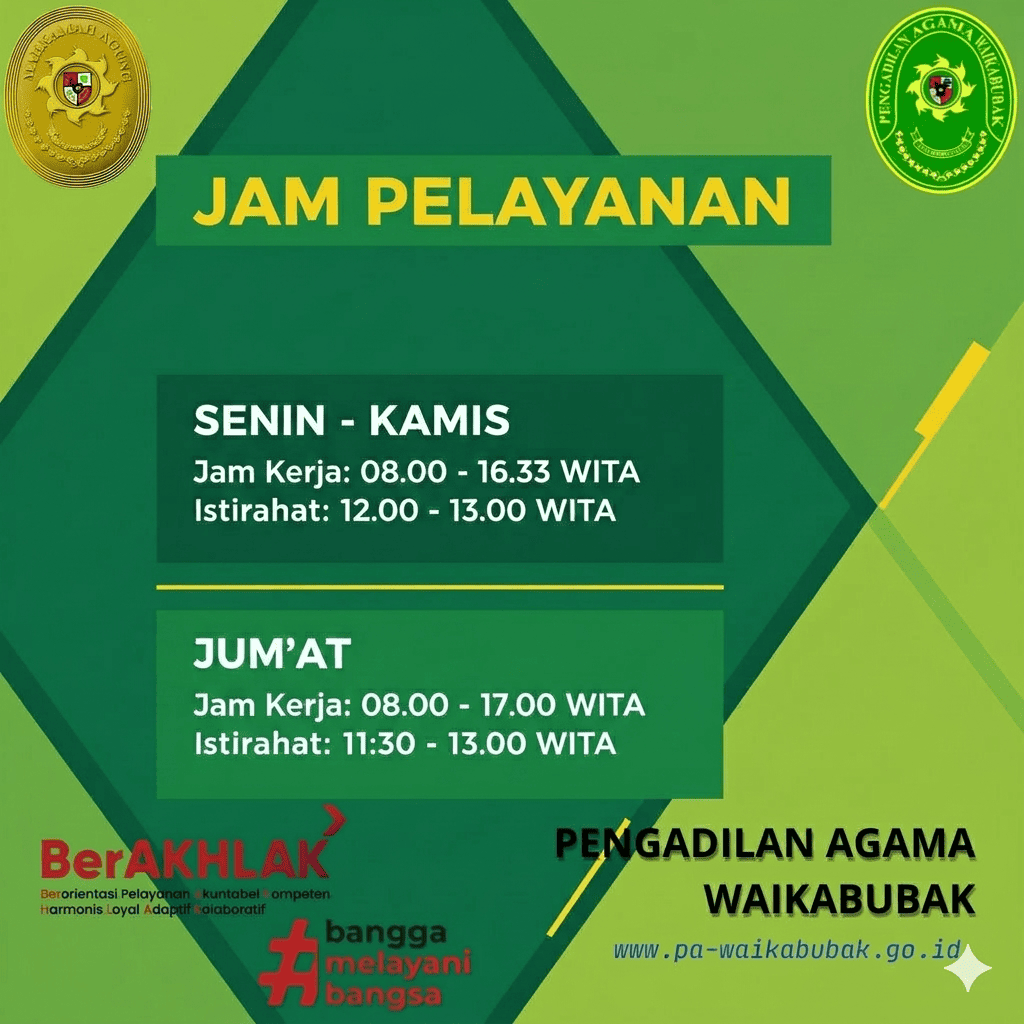 Beranda - Pengadilan Agama Waikabubak Dalam memberikan pelayanan, Pengadilan Agama Waikabubak tidak menerima pemberian dalam bentuk apapun, baik kepada perorangan maupun lembaga. Apabila terdapat penyimpangan pada saat menerima layanan kami, agar melaporkan melalui Sistem Informasi Pengawasan (SIWAS) Badan Pengawasan Mahkamah Agung Republik Indonesia dengan mengakses link: https://siwas.mahkamahagung.go.id.