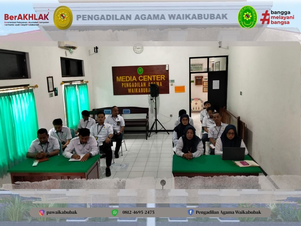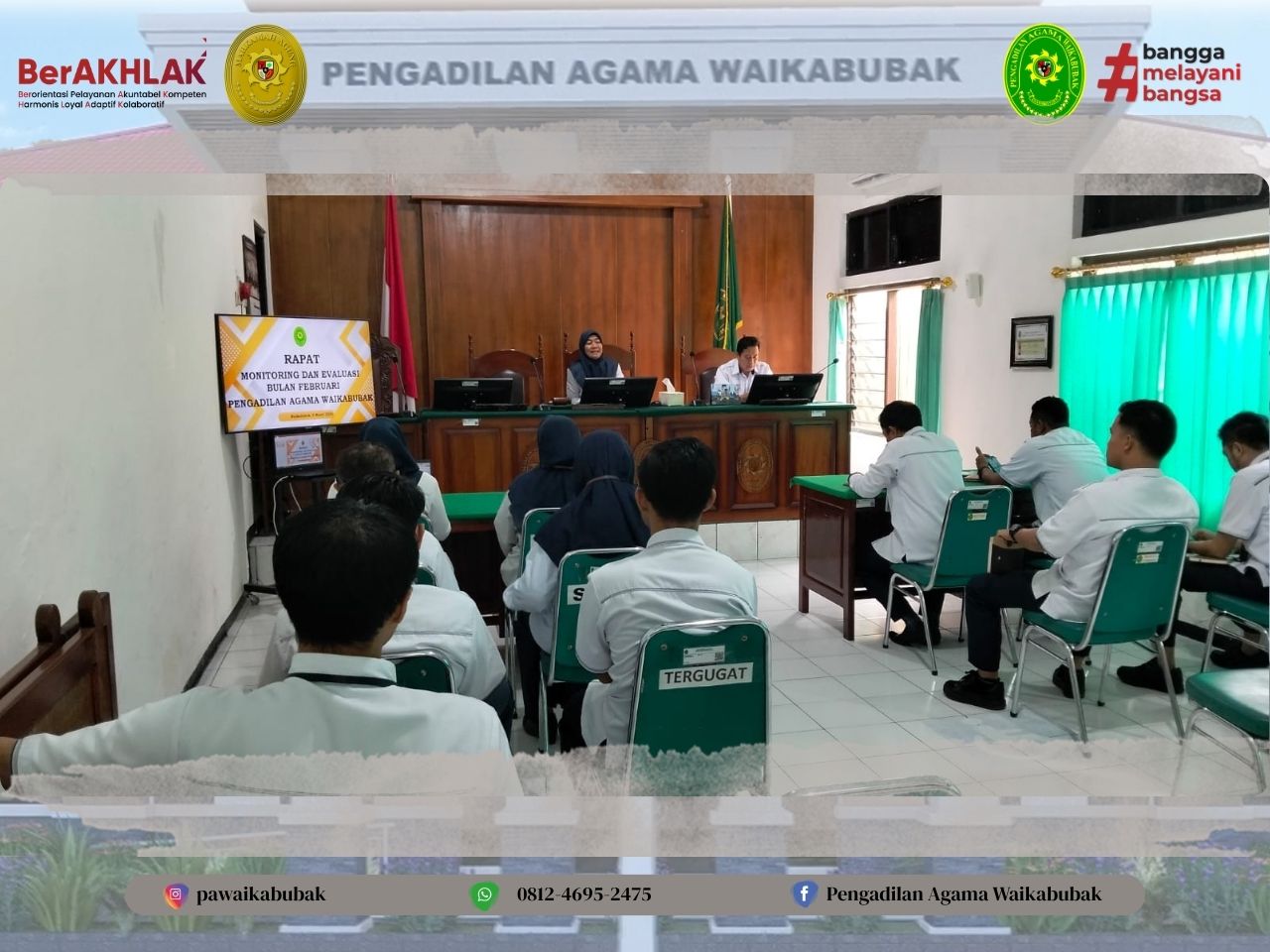 Waikabubak, 09 Maret 2026 – Bertempat di Ruang Media Center, Pengadilan Agama (PA) Waikabubak menyelenggarakan Rapat Monitoring dan Evaluasi (Monev) untuk periode kinerja bulan Februari 2026. Rapat ini dipimpin langsung oleh jajaran pimpinan dan dihadiri oleh Panitera, Sekretaris, Pejabat Struktural dan Fungsional, serta seluruh aparatur termasuk ASN, CPNS, dan PPPK di lingkungan PA Waikabubak.